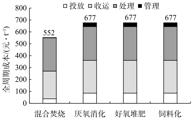 混合焚燒的全周期費(fèi)用最低,而分類處理的全周期費(fèi)用高出 125 元·t?1。這主要是由于垃圾分類增加了前端投放督導(dǎo)和宣教監(jiān)管費(fèi)用,此外收運(yùn)費(fèi)用也略高于混合焚燒。除上述費(fèi)用外,垃圾收運(yùn)處理設(shè)施也會(huì)占用一定的土地,由于占地面積和工藝路線、設(shè)計(jì)方案有關(guān),同時(shí)土地費(fèi)用差別很大,這里不計(jì)入比較。
