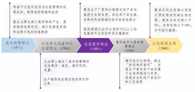 1991年頒布的《包裝廢棄物法》將包裝廢棄物的收集和處理責(zé)任從過去的各個行政州政府分?jǐn)偨o了各生產(chǎn)廠家、分銷商等企業(yè)機(jī)構(gòu),要求生產(chǎn)廠家和分銷商回收其產(chǎn)品包裝,并進(jìn)行再利用,該法催生了德國著名的“二元回收系統(tǒng)”(即“綠點(diǎn)公司”),與公共環(huán)衛(wèi)回收系統(tǒng)平行運(yùn)作。
