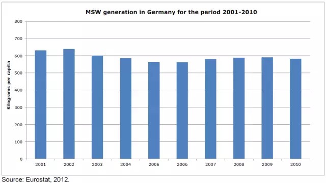 根據(jù)歐洲統(tǒng)計(jì)局的數(shù)據(jù),從2001年至2010年,德國的城市生活垃圾總產(chǎn)生量在5000萬噸左右浮動,但是人均垃圾產(chǎn)生量有所下降,從2001年的632kg/a(1.73kg/d)減少到2006年的564kg/a(1.55kg/d)。