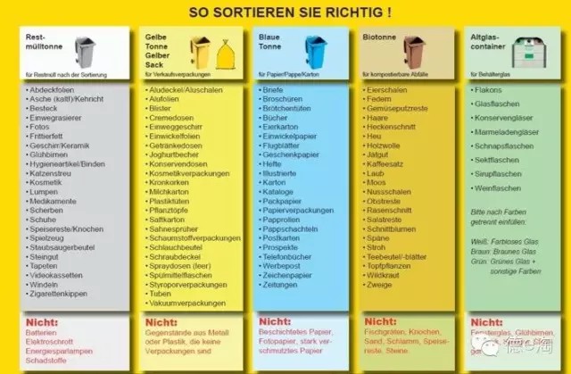 此外,居民需要把大件垃圾、有毒有害垃圾或電子廢棄物投放到專門的回收站內(nèi)。裝修垃圾需要預(yù)定一個大型垃圾箱,居民可以自己送到垃圾處理中心,但一般由于過重過大會叫上門收取服務(wù),垃圾按重量計(jì)算。舊衣物垃圾可以放進(jìn)居民區(qū)附近的紅十字會設(shè)立的專門收取舊衣物的箱子。舊家具家電則可以放在家門口,讓需要的人拿走,也會有專門的人來收取舊家電。在德國,垃圾分類是每個公民的義務(wù),如果分類不到位,將受到高額罰款,且個人的社會信譽(yù)也會受到影響。為了讓居民熟悉垃圾的分類原則,很多城市都印發(fā)了專門的《垃圾分類說明》。在每年年初,政府都會將新的《垃圾分類說明》和《垃圾清運(yùn)時(shí)間表》挨家挨戶投到各家郵箱,上邊有該家庭所屬的街道的名稱還有每周固定時(shí)間清理何種垃圾的信息,然后在指定日期前一天把某種固定的垃圾桶或垃圾袋放到街上等待收運(yùn)。政府也采取了一系列措施來監(jiān)管公民的垃圾行為(這部分內(nèi)容來源于網(wǎng)絡(luò))。