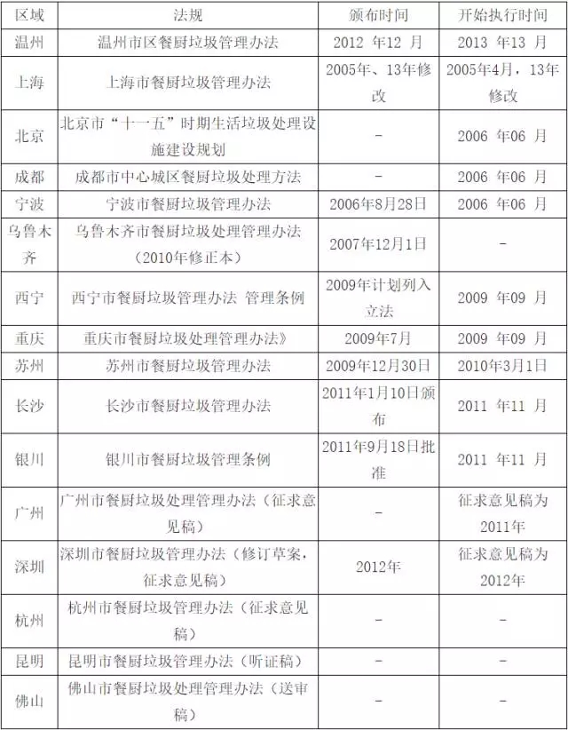 部分城市餐廚垃圾管理辦法