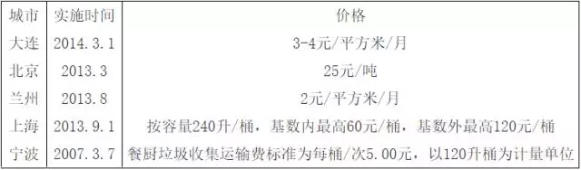 我國部分城市餐廚垃圾處理收費標(biāo)準(zhǔn)