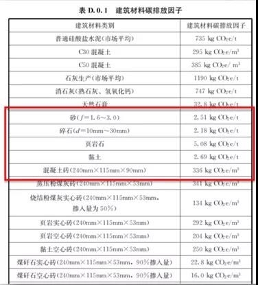 在“雙碳”目標下,來看建筑垃圾處理。《建筑碳排放計算標準》(GB/T 52366-2019)6.2.5條中規(guī)定,建材生產(chǎn)時,當使用低價值廢料作為原料時,可忽略其上游過程的碳過程。當使用其他再生原料時,應(yīng)按其所替代的初生原料的碳排放的50%計算;建筑建造和拆除階段產(chǎn)生的可再生建筑廢料,可按其可替代的初生原料的碳排放的50%計算,并應(yīng)從建筑碳排放中扣除。下表顯示,砂、碎石等骨料的碳排放因子比混凝土磚的碳排放小了2個數(shù)量級。