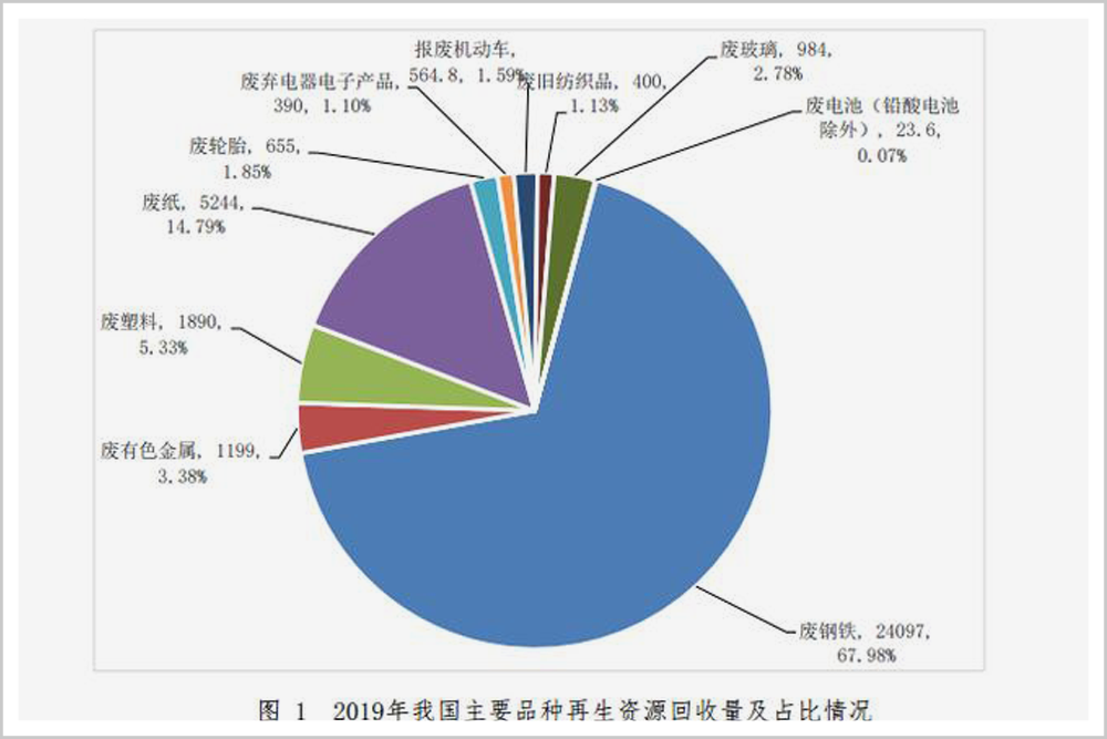 據(jù)商務(wù)部《中國再生資源回收行業(yè)發(fā)展報(bào)告(2020)》,我國可再生資源回收主要集中在廢鋼鐵、廢有色金屬、廢塑料、廢輪胎、廢紙、廢棄電器電子產(chǎn)品、報(bào)廢機(jī)動(dòng)車、廢舊紡織品、廢玻璃、廢電池等領(lǐng)域,2019年底,它們的回收總量超過3.5億噸。