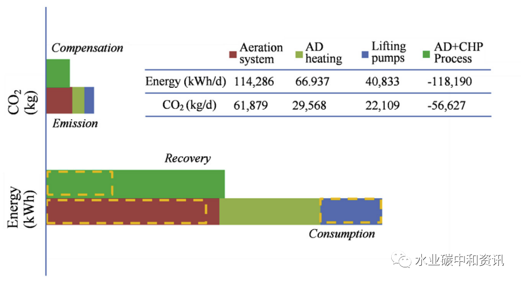 另一方面,污水中余溫熱能可以通過水源熱泵轉化出熱量,以平衡能量赤字,甚至達到碳中和。一項關于污水處理廠(普遍COD = 200 ~ 400 mg/L)能量平衡評估表明,中國剩余污泥厭氧消化產(chǎn)甲烷只能彌補約50%的運行能量消耗(Hao et al.)。進一步研究表明,水源熱泵能夠有效轉化污水熱能,用以加熱污水處理廠及其周邊建筑,可提供約0.20 kWh·m-3·℃-1 凈電當量。總的來說,中國有機物及熱能能夠有效供給充足的電當量,足以達到碳中和運行目標。污水處理廠能耗及碳排放情況
