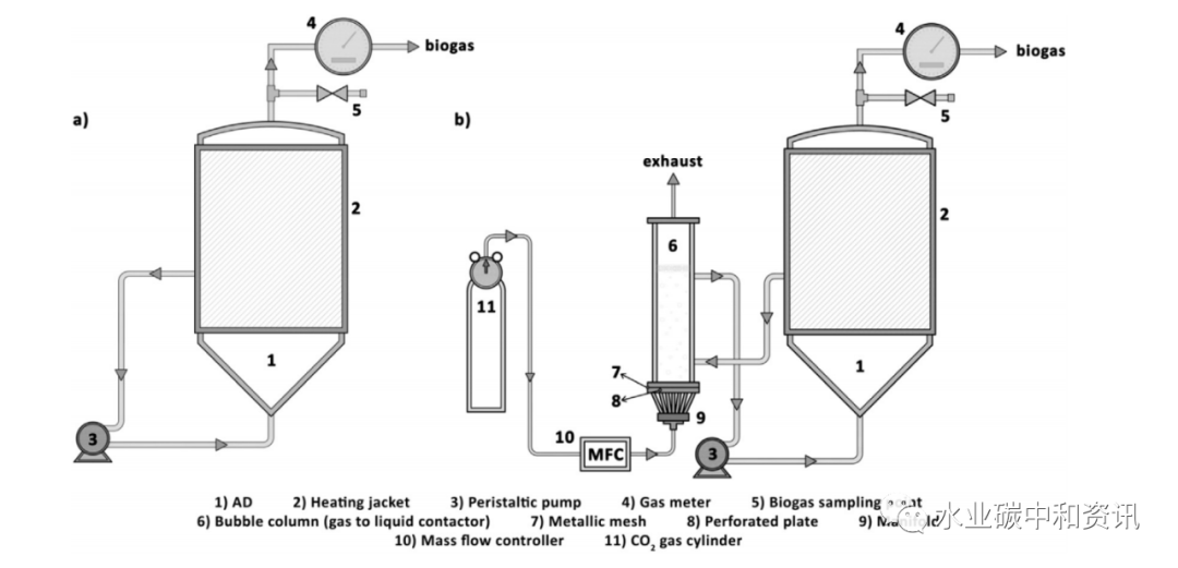如上所述,剩余污泥與外源固體/液體有機物共消化是實現(xiàn)碳中和的一種潛在途徑。而在厭氧消化中投加CO2也能刺激甲烷產(chǎn)生。一項小試研究證明,向厭氧消化池中投加濃縮有機廢物,適當?shù)靥岣哂袡C負荷及縮短的停留時間,可以提高甲烷產(chǎn)量。因此,市政污水處理廠中可有效應用熱電聯(lián)產(chǎn),以大大節(jié)省成本(Tandukar and Pavlostathis)。選擇口香糖制造廠和脫水脂肪油脂液產(chǎn)生的工業(yè)廢液作為外部有機物,與剩余污泥(初級﹕二級=40﹕60TS質量比)共消化。結果顯示,沼氣產(chǎn)量明顯增加,剩余污泥額外降解1.1~30.7%。沼氣和甲烷產(chǎn)量都非常接近能夠彌補能量赤字之目標水平。此外,共消化出水水質與只投加剩余污泥控制組相近,說明共消化沒有負面影響。其它有機物與剩余污泥共消化機制相同。一項小試究以牛糞(MN)與外部有機廢物(食品廢物—FW、堿性水解液—AH和粗制甘油—GY)共消化與牛糞單獨消化對比(Usack and Angenent; Regueiro et al.);運行900 d后,4組中溫平行共消化反應器顯示出比甲烷產(chǎn)量(SMY)信息,與GY共消化最適宜總有機負荷率(OLR)為3.2 gVS/L·d(MN : GY = 62:38),最佳SMY為549±25 ml CH4/gVS;FW與AH共消化SMY數(shù)值相近(約300 ml CH4/gVS,對應OLD =3.9 gVS/L·d,MN:FW = 51:49及OLD = 2.7 gVS/L·d,MN:AH=75:25)。眾所周知,CO2是在消化過程中伴隨著甲烷產(chǎn)生的產(chǎn)物。而另一方面,利用厭氧消化進行CO2捕集固定是一種潛力十足的碳減排策略。兩個處理食品垃圾的厭氧消化試驗進行了225 d監(jiān)測,實驗組定期使用氣泡柱充入CO2(Fernandez et al.)。實驗組測試CH4產(chǎn)率為0.56±0.13 m3 CH4/kgVS·d(對照組為0.45±0.05 )沼氣中CH4濃度為68%,額外攝取了外源CO2 0.55 kg,H2濃度增加了2.5 倍,這歸因于CO2溶解以及酸化與產(chǎn)氫途徑改變。