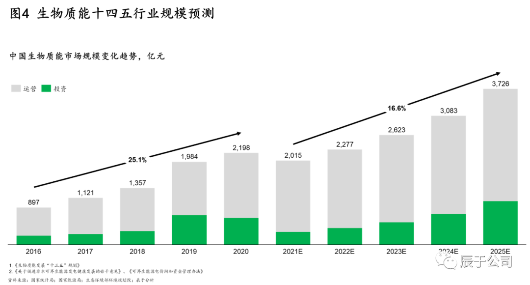 辰于預(yù)測(cè),隨著“30·60”雙碳目標(biāo)引導(dǎo)下的能源革命和能源轉(zhuǎn)型,以及相關(guān)政策支持(例如明確對(duì)存量、增量的生物質(zhì)發(fā)電項(xiàng)目將按照新增不欠的原則由國(guó)家繼續(xù)給予電價(jià)補(bǔ)貼,并鼓勵(lì)金融機(jī)構(gòu)按照市場(chǎng)化原則對(duì)列入補(bǔ)助項(xiàng)目清單的企業(yè)予以支持),生物質(zhì)能市場(chǎng)“十四五”期間的投資和運(yùn)營(yíng)規(guī)模將持續(xù)提升,復(fù)合增長(zhǎng)率16.6%,到2025年達(dá)到3700億元規(guī)模(見(jiàn)圖4)。投資方面,預(yù)計(jì)生物天然氣投資額最高,增長(zhǎng)也最快;運(yùn)營(yíng)方面,生物質(zhì)發(fā)電占比最高,但生物天然氣的增速最快。