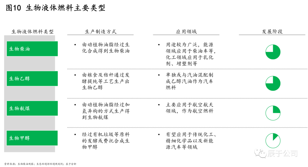 生物液體燃料是指把生物質(zhì)經(jīng)過(guò)發(fā)酵提純或者生化合成的方式制造成乙醇或油類等液體燃料,目前主要包括生物柴油、生物乙醇、生物航煤、生物甲醇等類型,生產(chǎn)制造方式各異,其中生物柴油、生物乙醇發(fā)展較為成熟(圖10)。