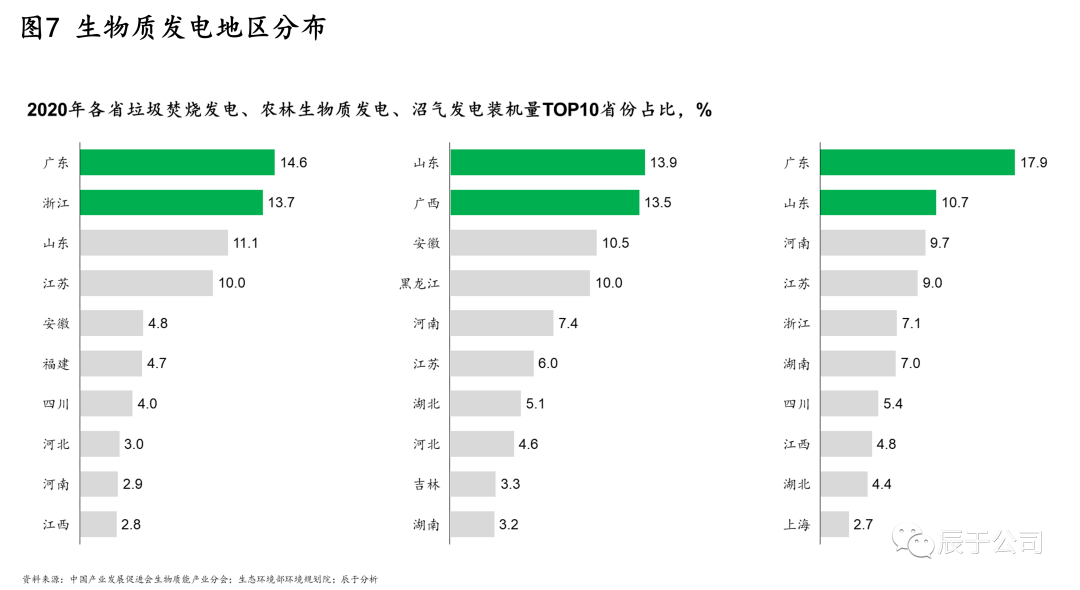 在地區(qū)分布上,各類型的生物質(zhì)發(fā)電集中于華東華南地區(qū),但各地區(qū)側(cè)重點(diǎn)有所不同。截至2020年底,垃圾焚燒發(fā)電集中在廣東省、浙江省、山東省、江蘇省、安徽省等地區(qū),合計(jì)占全國(guó)累計(jì)裝機(jī)容量的54%;農(nóng)林生物質(zhì)發(fā)電主要集中于山東省、湖北省、安徽省、黑龍江省、河南省,合計(jì)占比達(dá)到55.3%;沼氣發(fā)電主要集中于廣東省、山東省、河南省、江蘇省、浙江省,合計(jì)占比達(dá)到54.3%(見(jiàn)圖7)。