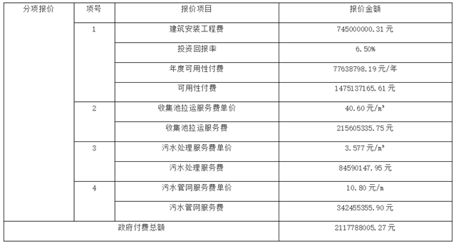 雙方合作期限20年,建設(shè)期1年、運(yùn)營(yíng)期19年。采用建設(shè)-運(yùn)營(yíng)-移交(BOT)的操作模式,于合作期滿(mǎn)后,由項(xiàng)目公司將項(xiàng)目資產(chǎn)無(wú)償移交給政府或其他政府指定機(jī)構(gòu)。預(yù)中標(biāo)項(xiàng)目投資90404萬(wàn)元,政府付費(fèi)2117788005.27元。