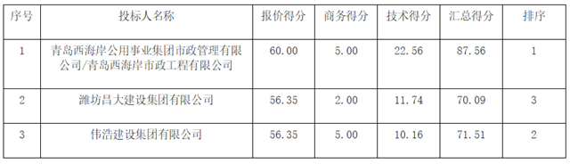 第1名:青島西海岸公用事業(yè)集團(tuán)市政管理有限公司/青島西海岸市政工程有限公司(聯(lián)合體);第2名:偉浩建設(shè)集團(tuán)有限公司;第3名:濰坊昌大建設(shè)集團(tuán)有限公司。