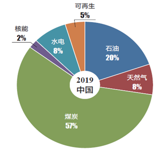 圖4:2019年中國一次能源結(jié)構(gòu)。數(shù)據(jù)來源:《BP世界能源統(tǒng)計年鑒》