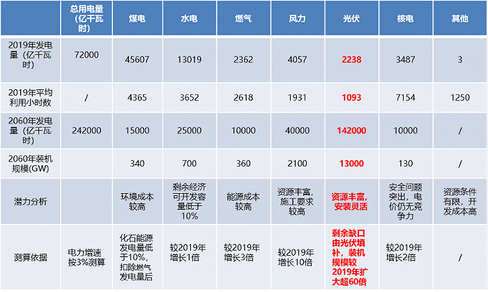 按最保守估算,電力消費(fèi)年均增速3%,預(yù)計到2060年,中國電力年消費(fèi)量將超過24萬億千瓦時。根據(jù)現(xiàn)在可以預(yù)測的能源相關(guān)技術(shù),我們對發(fā)電側(cè)各能源逐項進(jìn)行分析,大致如下。