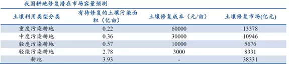 我國(guó)土壤污染類型包括農(nóng)業(yè)耕地土壤污染、城市工業(yè)用地土壤污染以及礦區(qū)土壤污染。目前,我國(guó)待修復(fù)的污染場(chǎng)地?cái)?shù)量非常之多,保守估計(jì)超過50萬塊。其中,耕地土壤修復(fù)投資需求在3萬億以上,城市土壤修復(fù)投資需求1萬億以上,礦區(qū)土壤修復(fù)投資需求可達(dá)近2萬億。(備注:由于修復(fù)分為輕重緩急,分階段進(jìn)行,而且受到資金的制約,所以預(yù)測(cè)的投資需求,和真正會(huì)去修復(fù)的地塊,不是同一個(gè)概念)