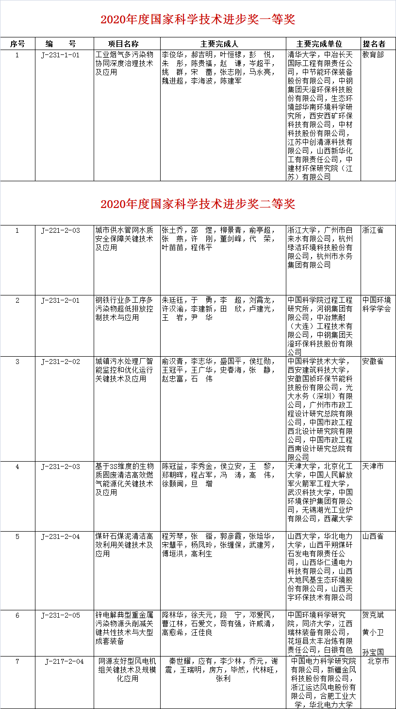 環(huán)境商會(huì)匯總整理了生態(tài)環(huán)境領(lǐng)域獲獎(jiǎng)名單,共有11個(gè)項(xiàng)目榮獲2020年國(guó)家科技獎(jiǎng),其中,王愛(ài)杰、彭永臻、中國(guó)科學(xué)院生態(tài)環(huán)境研究中心程浩毅、梁斌、中持股份邵凱、信開(kāi)水環(huán)境侯鋒等共同完成的“污水深度生物脫氮技術(shù)及應(yīng)用”項(xiàng)目榮獲國(guó)家技術(shù)發(fā)明獎(jiǎng)二等獎(jiǎng),李俊華,郝吉明、中節(jié)能環(huán)保裝備等聯(lián)合完成的“工業(yè)煙氣多污染物協(xié)同深度治理技術(shù)及應(yīng)用”項(xiàng)目榮獲國(guó)家科技進(jìn)步獎(jiǎng)一等獎(jiǎng);俞漢青、中節(jié)能國(guó)禎、光大水務(wù)等聯(lián)合完成的“城鎮(zhèn)污水處理廠智能監(jiān)控和優(yōu)化運(yùn)行關(guān)鍵技術(shù)及應(yīng)用”;新疆金風(fēng)科技等申報(bào)的“網(wǎng)源友好型風(fēng)電機(jī)組關(guān)鍵技術(shù)及規(guī)?;瘧?yīng)用”等項(xiàng)目榮獲國(guó)家科技進(jìn)步二等獎(jiǎng)。