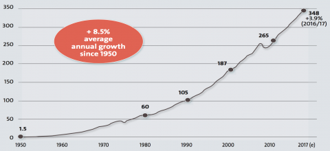 但是請環(huán)顧一下四周,有沒有發(fā)現(xiàn)你其實是被塑料包圍著。無論你在哪,塑料,這個人類創(chuàng)造的材料它一定在你身邊。自從上世紀五六十年代塑料被規(guī)模化生產(chǎn)以來,它已經(jīng)取代了大部分其它材料,被用到了人類生活生產(chǎn)的各方各面。全球2018年生產(chǎn)的塑料總量按體積計算的話已經(jīng)超過了鋼的產(chǎn)量,達3.6億噸(塑料平均密度約1.1;鋼18.3億噸,密度7.8)。全球累計生產(chǎn)的塑料到2019年達到90億噸,相當于1000座北京景山的重量。