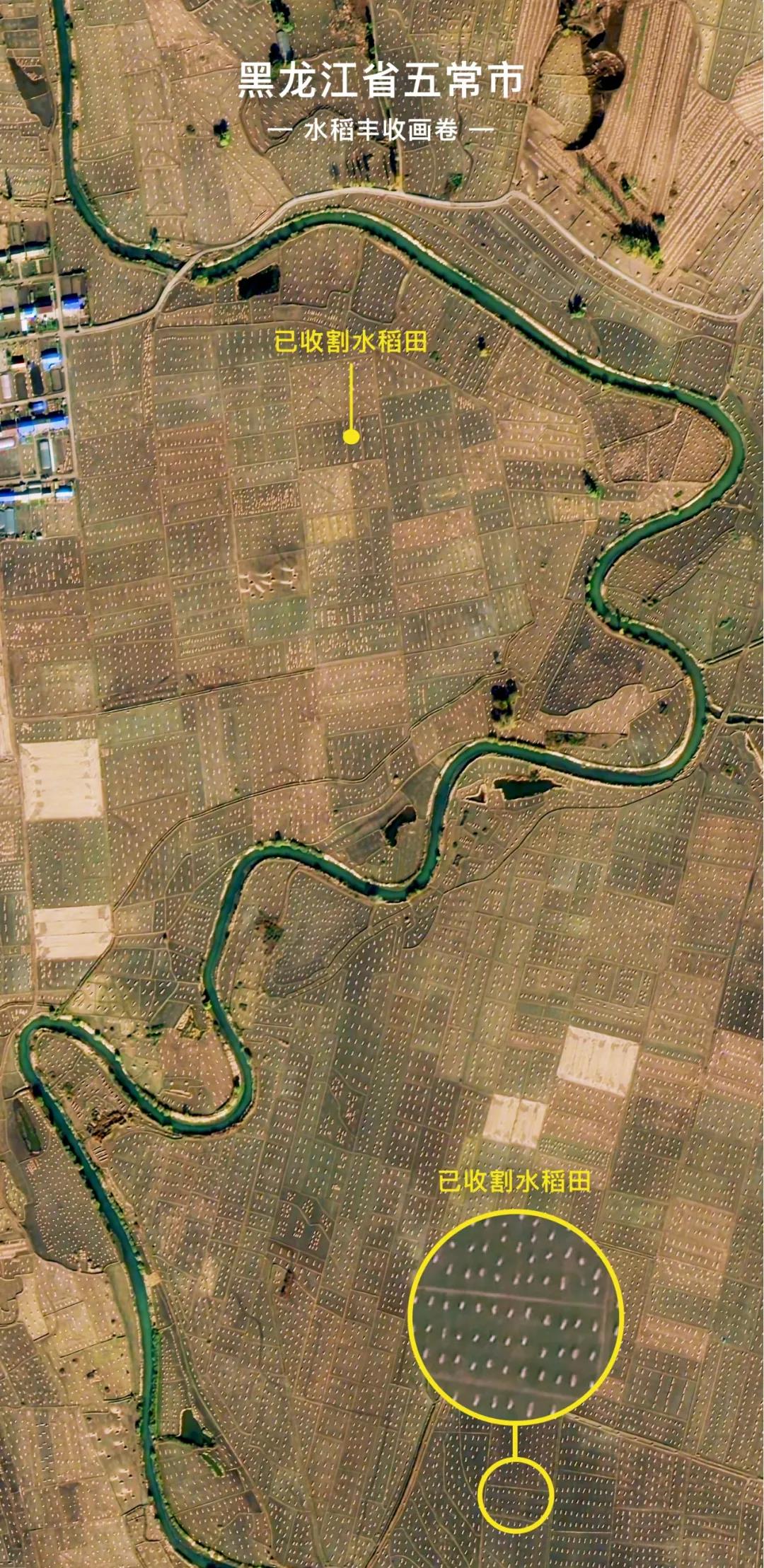 位于拉林河右側區(qū)域的五常市,已經(jīng)完成了大面積的水稻收割工作。吉林一號衛(wèi)星“捕捉”到了這個優(yōu)質稻米產(chǎn)區(qū)的秋收盛況。