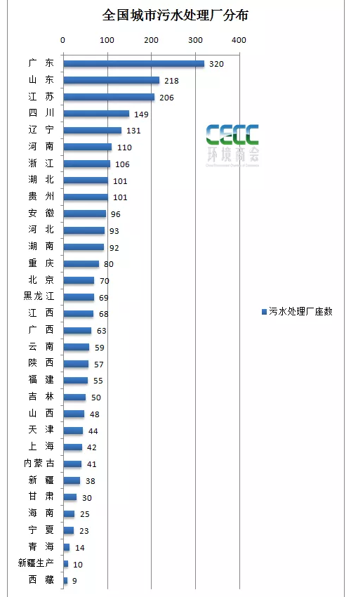 截至2020年,全國(guó)城市污水處理能力分布(按照各省市污水處理廠數(shù)量排序):