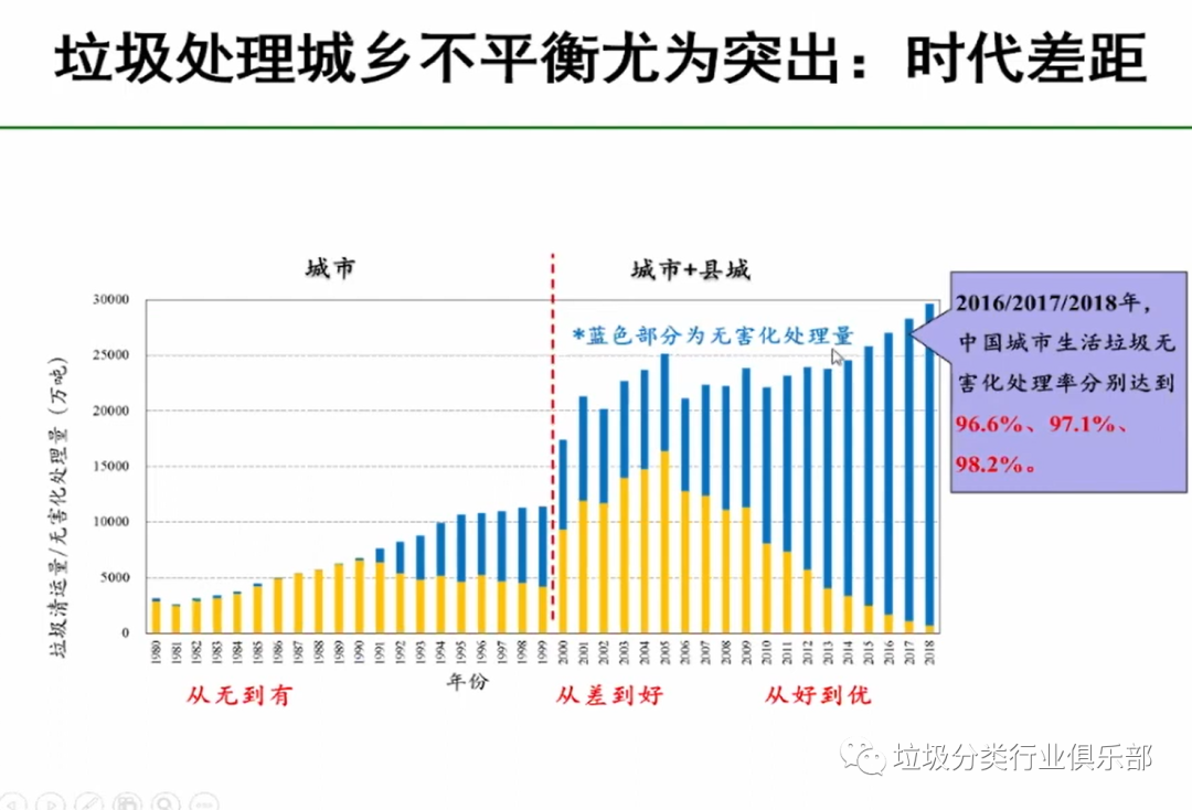 當前城市的垃圾處理基本問題已解決,現(xiàn)在要在分類的新的理念引領(lǐng)下,我們向著可以構(gòu)建新型模式,但是我們大的無害化處理這些問題已基本得到解決。2018年垃圾的垃圾無害化處理已經(jīng)達到了98.2%,而農(nóng)村連基本數(shù)據(jù)都沒有,農(nóng)村的數(shù)據(jù)很多都是估計的。現(xiàn)代化的管理是數(shù)字化的管理、信息化的管理,沒有數(shù)字就表明對它是沒有管理。底數(shù)不清,說明對它的管理薄弱。