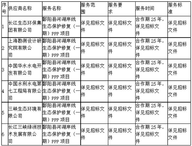 2021年11月23日,鄱陽(yáng)縣河湖岸線生態(tài)保護(hù)修復(fù)(一期)PPP項(xiàng)目資格預(yù)審公告顯示,長(zhǎng)江生態(tài)環(huán)保集團(tuán)牽頭上??睖y(cè)設(shè)計(jì)研究院有限公司、中國(guó)華水水電開(kāi)發(fā)有限公司、中國(guó)水利水電第七工程局有限公司、三峽生態(tài)環(huán)境有限公司和長(zhǎng)江三峽綠洲技術(shù)發(fā)展有限公司中標(biāo)。