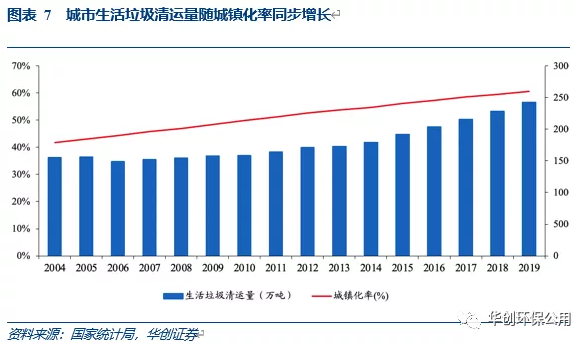 截至2019年,我國城鎮(zhèn)化率已達60.6%,提前完成“十三五”規(guī)劃提出的到2020年實現(xiàn)城鎮(zhèn)化率達到60%的目標,預計到2025年,中國城鎮(zhèn)化率有望達到66.5%。城鎮(zhèn)化率提升推動居民生活水平的提高,進而消費水平提升將從源頭帶來穩(wěn)步增長的垃圾清運量。2019年我國城鎮(zhèn)垃圾清運量達到2.4億噸,同比增加6.16%,假設2020-2025年年均增速6.5%,預計到2025年城鎮(zhèn)生活垃圾清運量有望達3.53億噸。