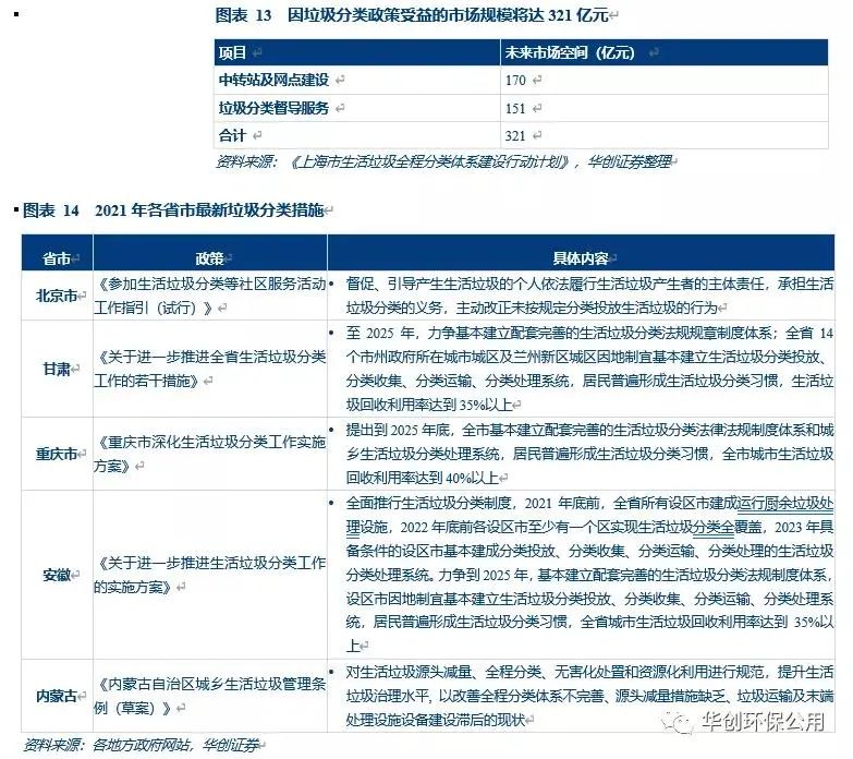 垃圾分類政策頻出,因政策受益的市場規(guī)模約321億。2020年11月,住房和城鄉(xiāng)建設部等部門印發(fā)《關于進一步推進生活垃圾分類工作的若干意見》的通知,明確力爭再用五年左右時間,在地級及以上城市因地制宜基本建立生活垃圾分類投放、分類收集、分類運輸、分類處理系統(tǒng)。2019年6月,住房和城鄉(xiāng)建設部等部門出臺了《關于在全國地級及以上城市全面開展生活垃圾分類工作的通知》,明確了“以建立46個重點城市垃圾分類處理系統(tǒng)為第一步,并逐步實現(xiàn)全國地級及以上城市的生活垃圾分類處理系統(tǒng)的建設”目標。我們認為垃圾分類政策的進一步推進和落實有望顯著帶動垃圾中轉(zhuǎn)站、回收網(wǎng)點和督導、清運服務需求的提升,未來市場空間約321億元。