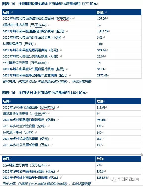 根據(jù)2020年中國城鄉(xiāng)建設統(tǒng)計年鑒,全國城市和縣城道路清掃保潔面積將達126.06億平方米,生活垃圾清運量約3.03億噸,公共廁所數(shù)量將達22.07萬座。將經(jīng)典環(huán)衛(wèi)項目的費用代入數(shù)據(jù)中,我們測算出全國城市和縣城環(huán)衛(wèi)市場年運營規(guī)模約為2177.42億元。全國鄉(xiāng)村道路清掃保潔面積將達91.24億平方米,生活垃圾清運量約1.85億噸,公共廁所數(shù)量將達12.95萬座。同樣將以前經(jīng)典環(huán)衛(wèi)項目的費用代入數(shù)據(jù)中,我們測算出全國鄉(xiāng)村環(huán)衛(wèi)市場年運營規(guī)模約為1284.34億元。加上此次垃圾分類帶來的空間提升,當前環(huán)衛(wèi)市場規(guī)模約為3800億。