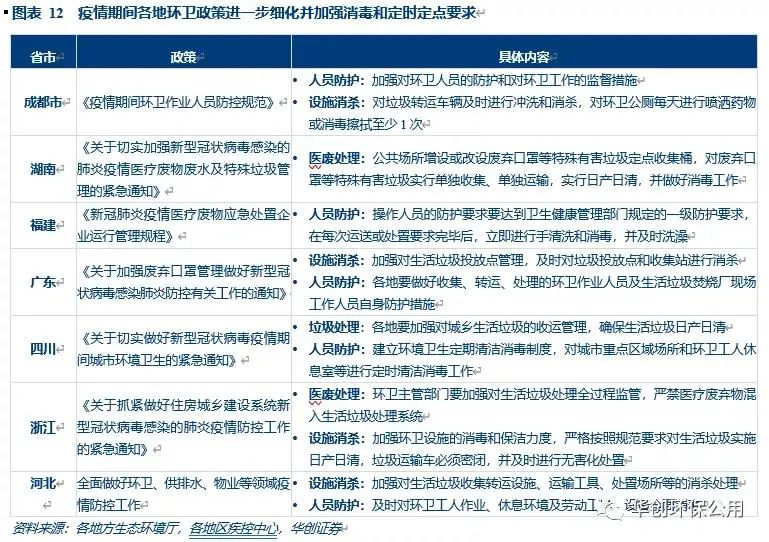 隨著疫苗接種率的提高,新冠疫情在國內(nèi)已經(jīng)得到了有效控制,但局部疫情仍然頻發(fā),引起社會公眾對于城市消毒和臟亂差管理問題的廣泛關注,全國各省市陸續(xù)出臺一系列通知和規(guī)范文件,明確了環(huán)衛(wèi)服務領域應對新型冠狀病毒肺炎疫情的工作方案。各項政策文件分別在醫(yī)廢處理、日常垃圾清理、環(huán)衛(wèi)設施消殺、公共環(huán)境消毒和環(huán)衛(wèi)人員防護等領域提出了具體的要求,為社會各界應對新冠疫情提供了指導。對于環(huán)衛(wèi)工作的高標準、精細化、專業(yè)化的要求,加大了對市政環(huán)衛(wèi)部門工作的挑戰(zhàn)。伴隨環(huán)衛(wèi)服務的需求釋放,環(huán)衛(wèi)服務市場化進程有望進一步加速。