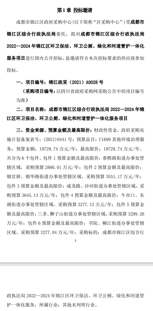 四川省公共資源交易網(wǎng)公布《成都市錦江區(qū)綜合行政執(zhí)法局2022—2024年錦江區(qū)環(huán)衛(wèi)保潔、環(huán)衛(wèi)公廁、綠化和河道管護(hù)一體化服務(wù)項(xiàng)目公開招標(biāo)公告》。