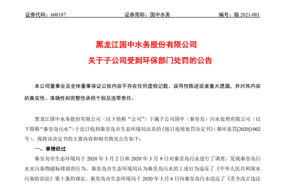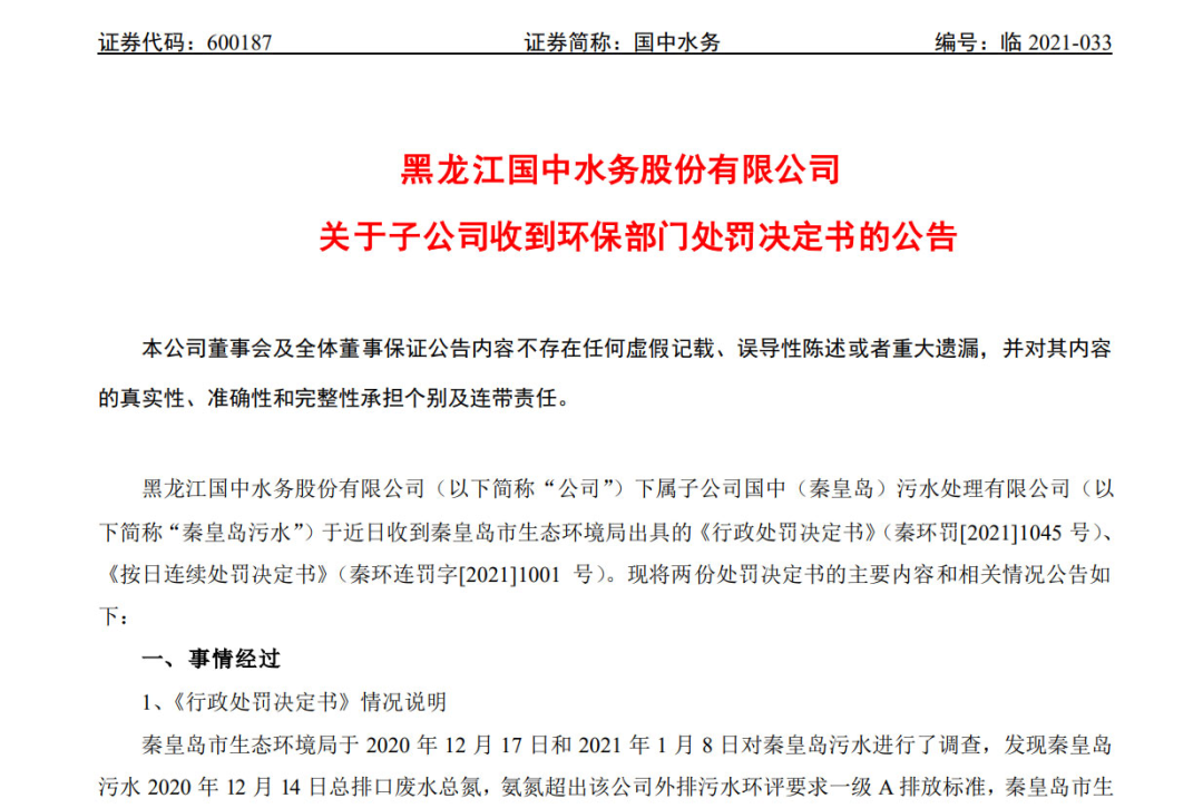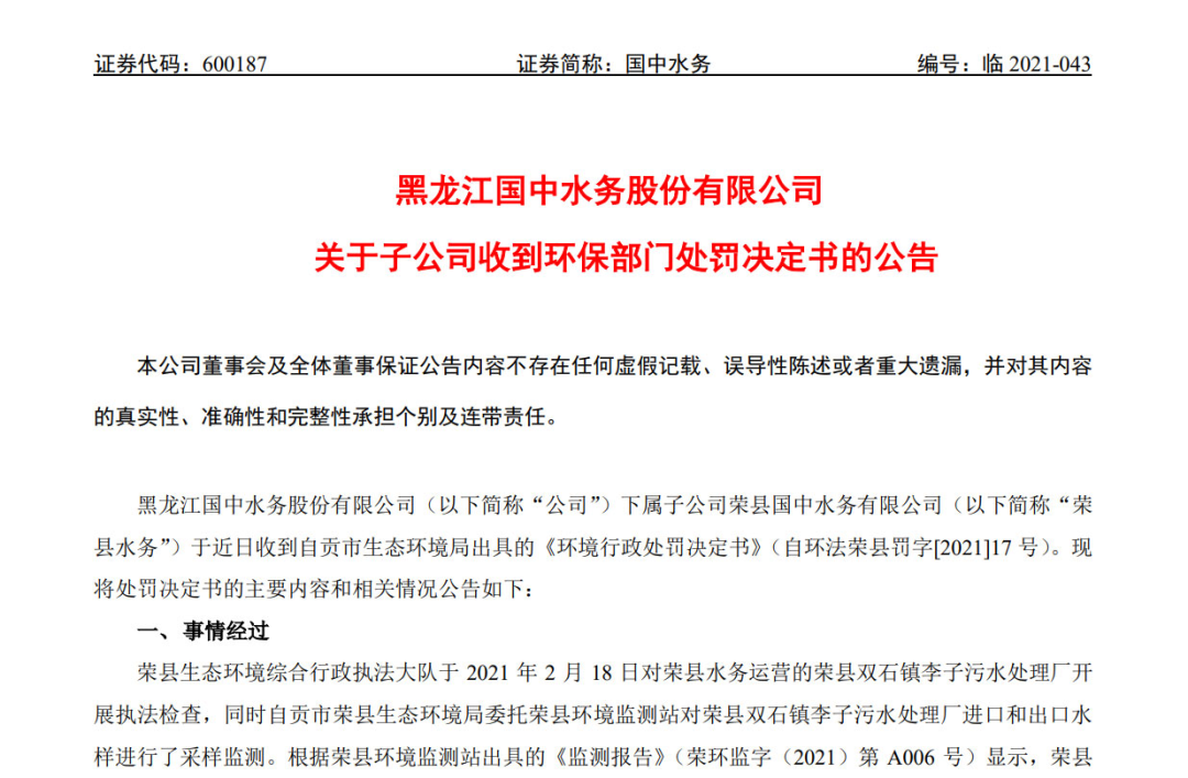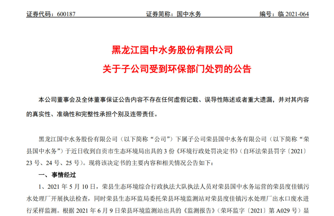 11月25日,國(guó)中水務(wù)(600187.SH)發(fā)布公告稱,其下屬子公司榮縣國(guó)中水務(wù)有限公司(下稱“榮縣國(guó)中水務(wù)”)因?yàn)椤斑M(jìn)水超標(biāo)導(dǎo)致的出水超標(biāo)及執(zhí)行標(biāo)準(zhǔn)認(rèn)定問題”,被罰共計(jì)85.70萬元。
