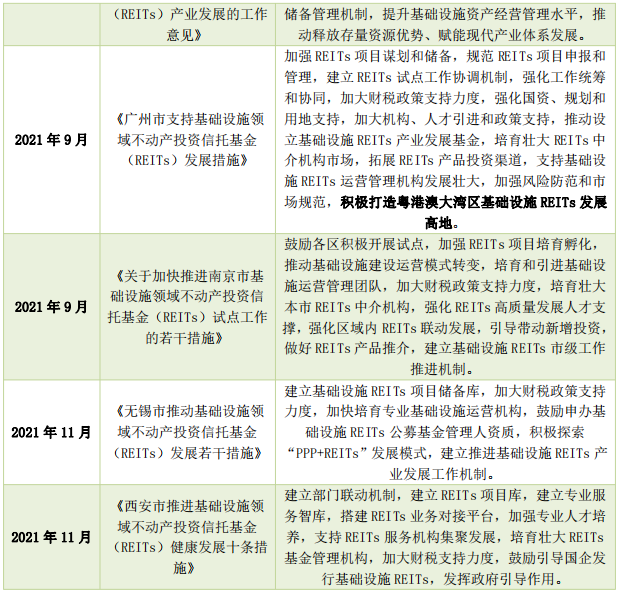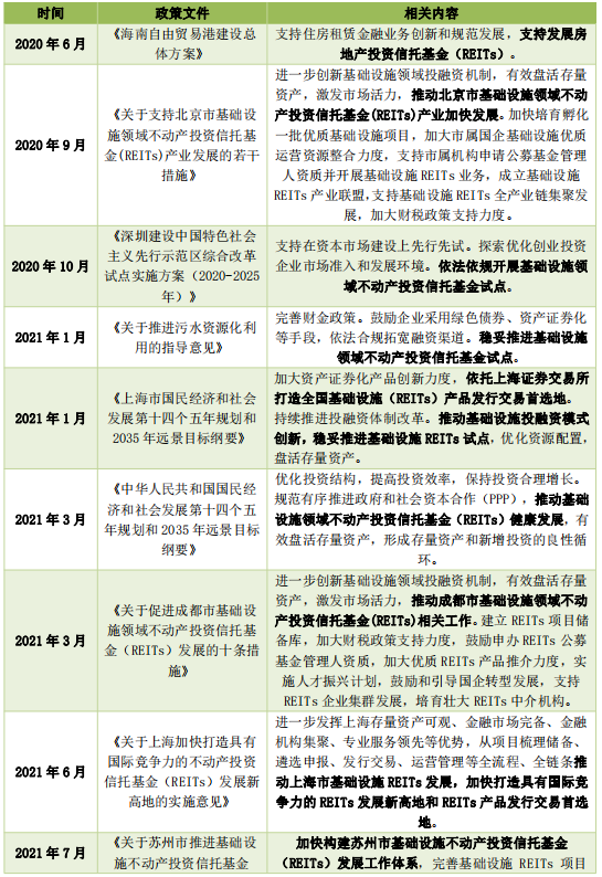 另外,中央、地方政府出臺(tái)的部分政策文件、省市區(qū)域的遠(yuǎn)景規(guī)劃也將REITs列為重要內(nèi)容之一,推動(dòng)REITs在重點(diǎn)省份、城市與行業(yè)的應(yīng)用和推廣。部分核心一、二線城市如北京、上海、成都、蘇州也相繼推出促進(jìn)本市及所在區(qū)域的基礎(chǔ)設(shè)施REITs發(fā)展的政策或?qū)嵤┐胧瑯?gòu)建本市基礎(chǔ)設(shè)施REITs發(fā)展工作體系,推動(dòng)地方基礎(chǔ)設(shè)施REITs健康持續(xù)發(fā)展。