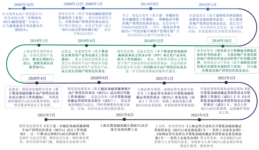 之后2021年1月,上海證券交易所、深圳證券交易所分別發(fā)布《上海證券交易所公開(kāi)募集基礎(chǔ)設(shè)施證券投資基金(REITs)業(yè)務(wù)辦法(試行)》、《深圳證券交易所公開(kāi)募集基礎(chǔ)設(shè)施證券投資基金(REITs)業(yè)務(wù)辦法(試行)》等文件,明確了基礎(chǔ)設(shè)施公募REITs的業(yè)務(wù)流程、審查標(biāo)準(zhǔn)和發(fā)售流程。中國(guó)證券業(yè)協(xié)會(huì)發(fā)布《公開(kāi)募集基礎(chǔ)設(shè)施證券投資基金網(wǎng)下投資者管理細(xì)則》,規(guī)范網(wǎng)下投資者參與基礎(chǔ)設(shè)施公募REITs網(wǎng)下詢價(jià)和認(rèn)購(gòu)業(yè)務(wù)。4月,上交所、深交所公布關(guān)于REITs業(yè)務(wù)辦理指南,《上海證券交易所公開(kāi)募集基礎(chǔ)設(shè)施證券投資基金(REITs)業(yè)務(wù)指南第1號(hào)——發(fā)售上市業(yè)務(wù)辦理》、《深圳證券交易所公開(kāi)募集基礎(chǔ)設(shè)施證券投資基金業(yè)務(wù)指南第1號(hào)——發(fā)售上市業(yè)務(wù)辦理》等文件發(fā)布,對(duì)辦理REITs的發(fā)售與上市等相關(guān)業(yè)務(wù)、市場(chǎng)參與人參與REITs基金詢價(jià)和發(fā)售進(jìn)行指導(dǎo)、提供參考。6月,首批基礎(chǔ)設(shè)施公募REITs產(chǎn)品在滬深交易所正式掛牌上市。7月,國(guó)家發(fā)改委發(fā)布《關(guān)于進(jìn)一步做好基礎(chǔ)設(shè)施領(lǐng)域不動(dòng)產(chǎn)投資信托基金(REITs)試點(diǎn)工作的通知》,進(jìn)一步推動(dòng)完善REITs試點(diǎn)的建設(shè)工作,包括擴(kuò)大試點(diǎn)區(qū)域、增加試點(diǎn)行業(yè)、細(xì)化基本要求等。