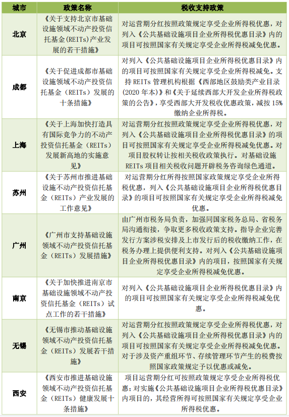 表3 主要城市REITs稅收支持政策