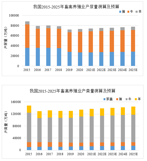 2019年,我國生豬市場受到“豬瘟”疫情影響,出欄量大幅下降。2020年受到新冠疫情全球化及進(jìn)出口貿(mào)易局勢影響,豬牛羊肉等市場預(yù)期有所恢復(fù)但增速不敵疫情前預(yù)期,畜牧行業(yè)整體受到一定影響,低谷期有所延長,預(yù)計(jì)三年內(nèi)市場將恢復(fù)平穩(wěn)。根據(jù)公開數(shù)據(jù)推算,我國畜禽養(yǎng)殖業(yè)主要類別禽畜產(chǎn)糞量將在10億噸左右,產(chǎn)尿量逾7億噸。