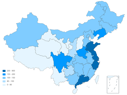 注:1、顏色越深代表該省秸稈資源化(此圖僅指能源化)可獲得水平越高,集約化開發(fā)價(jià)值越高。