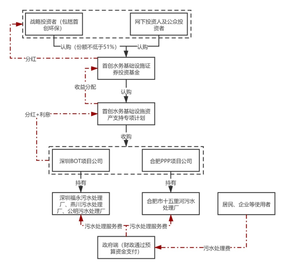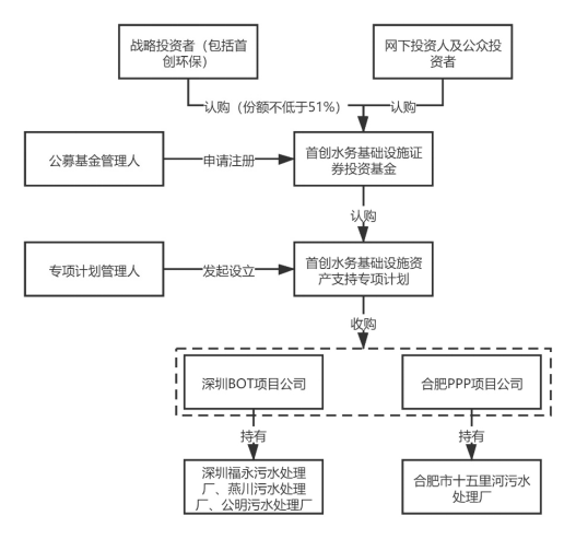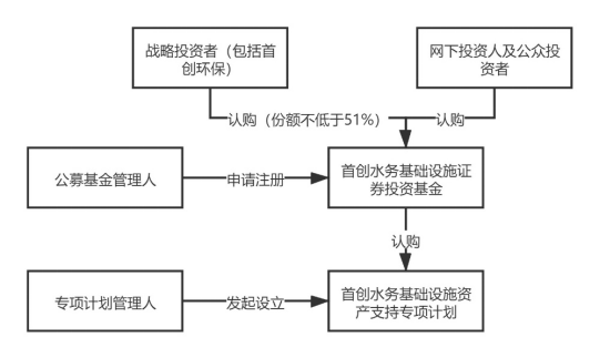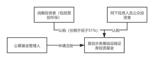 具體實(shí)施步驟為:首先,公募基金管理人富國基金向證監(jiān)會(huì)申請(qǐng)注冊(cè)首創(chuàng)水務(wù)基礎(chǔ)設(shè)施證券投資基金,取得注冊(cè)文件后,富國基金將基礎(chǔ)設(shè)施證券投資基金進(jìn)行公開發(fā)售,其中首創(chuàng)環(huán)保或其同一控制下關(guān)聯(lián)方作為戰(zhàn)略配售投資人參與認(rèn)購比例不低于本次基金份額發(fā)售數(shù)量的51%(實(shí)際發(fā)行時(shí)認(rèn)購比例為51%)。