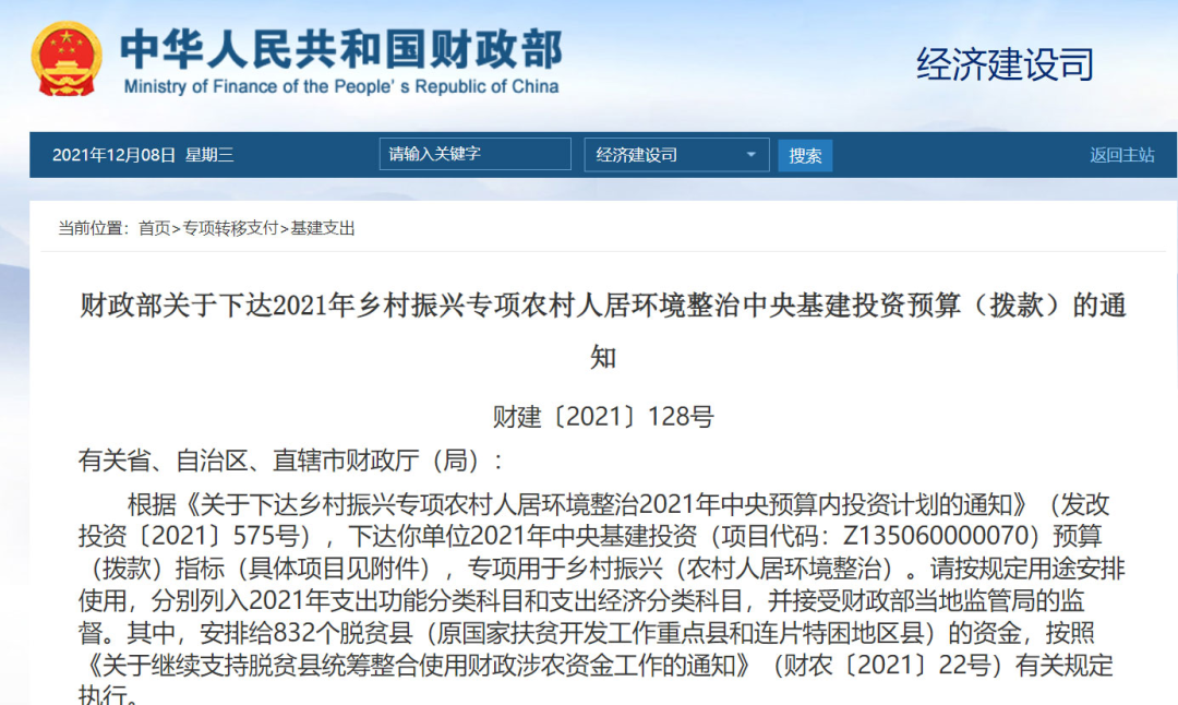 也就是說,農(nóng)村人居環(huán)境整治提升,主要的資金來源還是要靠地方。查了一下,今年5月12日,財政部就曾經(jīng)下達“2021年鄉(xiāng)村振興專項農(nóng)村人居環(huán)境整治中央基建投資預算(撥款)”,總額為29.6億元.去年8月,財政部也曾經(jīng)下達2020年的“農(nóng)村人居環(huán)境整治專項中央基建投資預算(撥款)”,當時的總額是29.756億元。從這兩年的情況看,每年全國大概30億吧,這是中央拿出來的錢。地方各級政府要保障農(nóng)村人居環(huán)境整治基礎設施建設和運行資金,統(tǒng)籌安排土地出讓收入用于改善農(nóng)村人居環(huán)境,鼓勵各地通過發(fā)行地方政府債券等方式用于符合條件的農(nóng)村人居環(huán)境建設項目。看得出來,地方政府的投入,主要來源是兩個:一是土地出讓金,二是發(fā)行地方債。