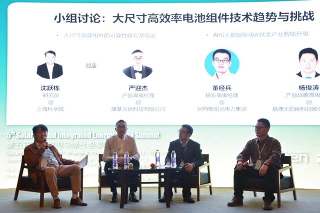 下午的小組討論主題為:大尺寸高效率電池組件技術趨勢與挑戰(zhàn),該討論由上海科學院研究員沈躍棟主持,隆基光伏科技有限公司產品高級經理嚴迎杰、阿特斯陽光電力集團研發(fā)高級經理董經兵、晶澳太陽能科技股份有限公司產品戰(zhàn)略高級經理楊俊濤積極參與了討論。嘉賓們圍繞大尺寸高效組件的可靠性研究及驗證、AI和大數據驅動光伏全產業(yè)智能升級等話題展開了交流和探討。臺上臺下積極互動,將第一天的會議推向了高潮。