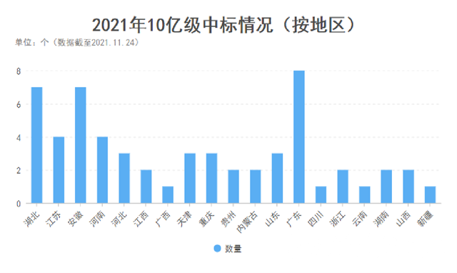 而從區(qū)域來(lái)看,廣東、湖北、安徽10億+標(biāo)的數(shù)量名列前三,江蘇、河南、河北、天津、重慶、山東等也有數(shù)個(gè)10億+標(biāo)的被拿下,區(qū)域市場(chǎng)熱度可見一斑。