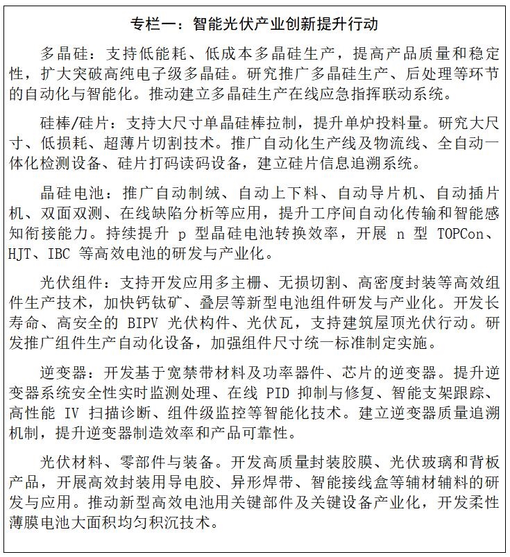 加快產(chǎn)業(yè)技術創(chuàng)新。推進智能光伏產(chǎn)業(yè)鏈技術創(chuàng)新,加快大尺寸硅片、高效太陽能電池及組件等研制和突破。夯實配套產(chǎn)業(yè)基礎,推動智能光伏關鍵原輔料、設備、零部件等技術升級。開展智能光伏與建筑節(jié)能、交通運輸、綠色農業(yè)等領域相結合的交叉技術研究。