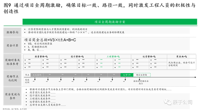 因此,工程管理的價值并非不可衡量,但是要有一定的前提——要有一個沒有水分的預算,和一個沒有偷工減料的結算。在以往服務的案例中,辰于將工程管理的激勵與整個項目全生命周期結合在一起,以整個項目的利潤最大化為目標,設定各個階段的反向約束條件,使工程管理的價值量化評估,更重要的是,實現(xiàn)了項目全生命周期收益的最大化(見圖9)。