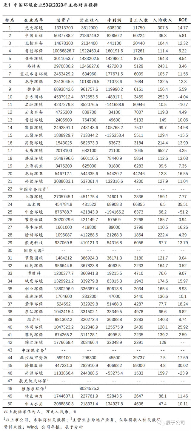 2021年7月全國工商聯(lián)環(huán)境商會發(fā)布了最新一期的中國環(huán)境企業(yè)50強(qiáng)榜單,辰于對榜單中企業(yè)的主要財(cái)務(wù)數(shù)據(jù)(見表 1)進(jìn)行統(tǒng)計(jì)發(fā)現(xiàn),光大環(huán)境高居榜首收入達(dá)到361億元,超過第二名65%;企業(yè)需要收入超過21億元才能進(jìn)入50強(qiáng),超過87億元才能進(jìn)入前10強(qiáng);由于主營業(yè)務(wù)差異,各企業(yè)在人均收入、ROE等指標(biāo)上也有較大差距,環(huán)衛(wèi)行業(yè)的企業(yè)人均收入都比較低,其他領(lǐng)域的人均收入平均150萬元左右。