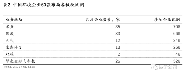 通過對中國環(huán)境企業(yè)50強(qiáng)的全面梳理,我們發(fā)現(xiàn)在業(yè)務(wù)布局上,水務(wù)、固廢、綠色金融與科技是這些企業(yè)布局較多的行業(yè),比例分別達(dá)到70%、66%、52%,生態(tài)修復(fù)、大氣和雙碳則較少企業(yè)布局,比例為26%、24%、4%(見表2)。