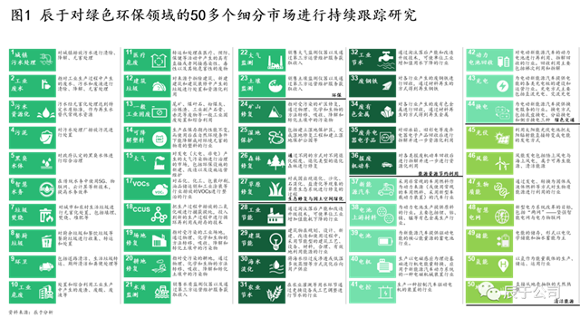 作為一家聚焦于綠色發(fā)展領(lǐng)域的專業(yè)咨詢機(jī)構(gòu),結(jié)合以往項(xiàng)目經(jīng)驗(yàn)以及業(yè)內(nèi)習(xí)慣,辰于對綠色環(huán)保行業(yè)范圍進(jìn)行了明確劃分,目前已經(jīng)持續(xù)跟蹤50多個細(xì)分領(lǐng)域(見圖1)。有意思的一點(diǎn)是,過去的環(huán)保行業(yè)范圍一般是指包含供水、各類污染物末端處置和治理以及環(huán)境監(jiān)測在內(nèi)的傳統(tǒng)環(huán)保領(lǐng)域,雙碳戰(zhàn)略提出后,當(dāng)人們談到“環(huán)保”時,更多是指“綠色環(huán)保”的概念,節(jié)能、清潔能源、雙碳業(yè)務(wù)等行業(yè)也被納入。