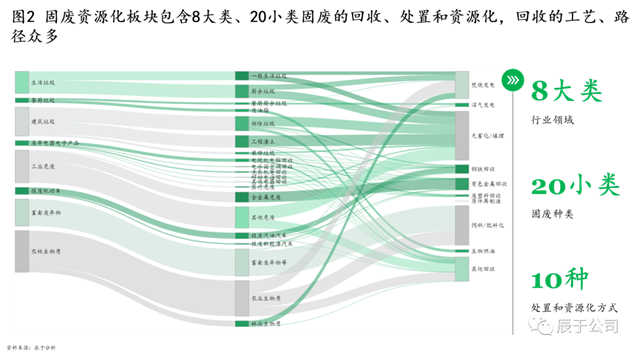 固廢資源化板塊包含8大類、20小類固廢的回收、處置和資源化,回收的工藝、路徑眾多(見圖2),除此之外還包含環(huán)衛(wèi)等服務(wù)領(lǐng)域,最大的特點(diǎn)就是規(guī)模大——當(dāng)前的總市場規(guī)模超過2萬億,足夠容納20個千億級環(huán)保企業(yè),而且“十四五”期間預(yù)計(jì)還將保持8%~10%的年復(fù)合增長率。