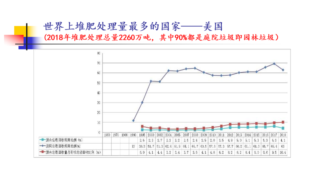 實際上,在全世界范圍內(nèi)比較,生活源、家庭源廚余垃圾及庭院垃圾(園林垃圾)堆肥利用量最大的國家是美國。美國在2018年垃圾堆肥處理總量達到2260萬噸,其中90%都是園林垃圾。