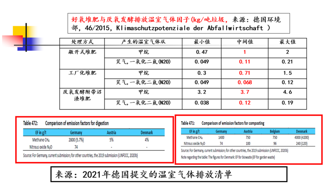 從歐盟提交給聯(lián)合國的數(shù)據(jù)來看,厭氧消化實際是增加溫室氣體的排放。歐洲的專家既然了解這個現(xiàn)實,為何還要到包括中國在內(nèi)的發(fā)展中國家來建議要做有機垃圾的厭氧或堆肥呢?其實背后也有更深層次的原因,一方面發(fā)展中國家財政實力相對較弱,難以普遍負(fù)擔(dān)高成本的垃圾焚燒發(fā)電。而另一方面在降污和減碳的雙重壓力下又切實需要減少有機垃圾的直接填埋。在這種復(fù)雜情況下,將有機垃圾分出一部分做厭氧或堆肥,實際還是能夠達到一定減排的效果。下圖中展示的是德國提交的溫室氣體排放清單中厭氧或堆肥工藝過程中,一噸有機垃圾處理排放的二氧化碳當(dāng)量。