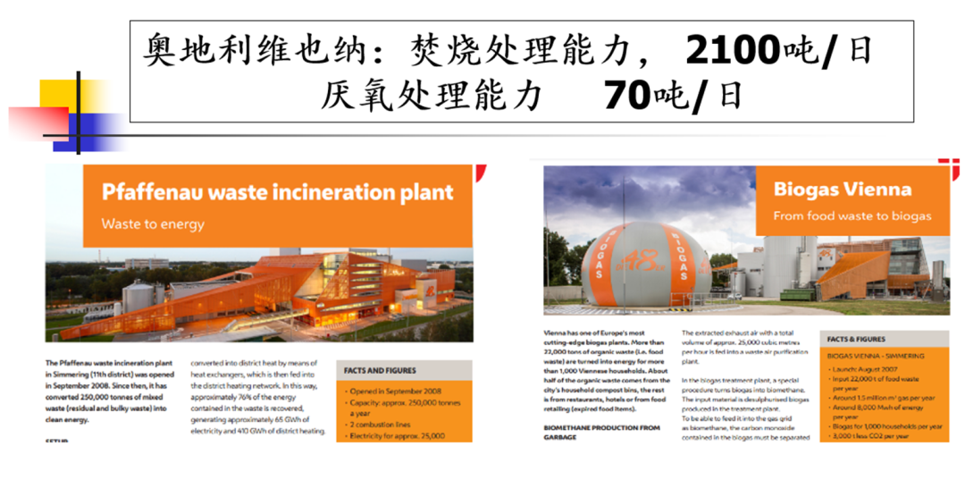 上圖是奧地利維也納的一個垃圾焚燒發(fā)電廠??梢钥吹皆摲贌龔S的一端有一個厭氧消化裝置,這個厭氧裝置主要處理從家庭分出來的廚余垃圾。我國的垃圾焚燒發(fā)電廠都有滲濾液處理裝置,且配置的比例遠(yuǎn)遠(yuǎn)大于圖中焚燒發(fā)電廠。圖中焚燒發(fā)電廠的焚燒能力是2100噸/日,其對應(yīng)的厭氧處理能力僅是70噸/日。而國內(nèi)2100噸/日的垃圾焚燒發(fā)電廠配的厭氧規(guī)模以垃圾處理規(guī)模的20%計也超過400噸/日。