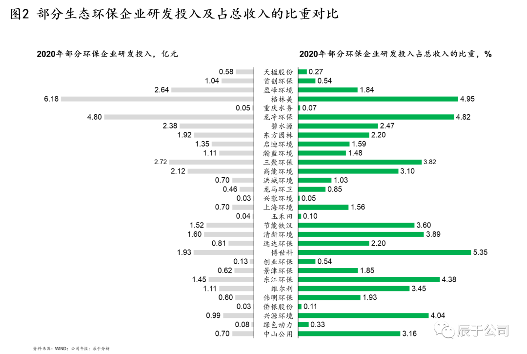 造成以上問題的原因很多,主要有兩個:一是國內(nèi)生態(tài)環(huán)保行業(yè)之前一直處于簡單、粗暴的“跑馬圈地”時代,強政府關(guān)系和低成本融資成為這一階段企業(yè)制勝的“不二法寶”,這種“浮躁”的大環(huán)境導(dǎo)致很多企業(yè)“重投建、輕技運”;二是創(chuàng)新型和革新型技術(shù)投入周期長,回報不明顯,很多企業(yè)尤其是三年任期制下的國企高層們?nèi)狈ψ銐蚰托?,容錯機制缺失也讓他們對高風(fēng)險的研發(fā)投入持謹(jǐn)慎態(tài)度,這從生態(tài)環(huán)保領(lǐng)域的上市企業(yè)的研發(fā)投入占收入的比重可見一斑(見圖2)。