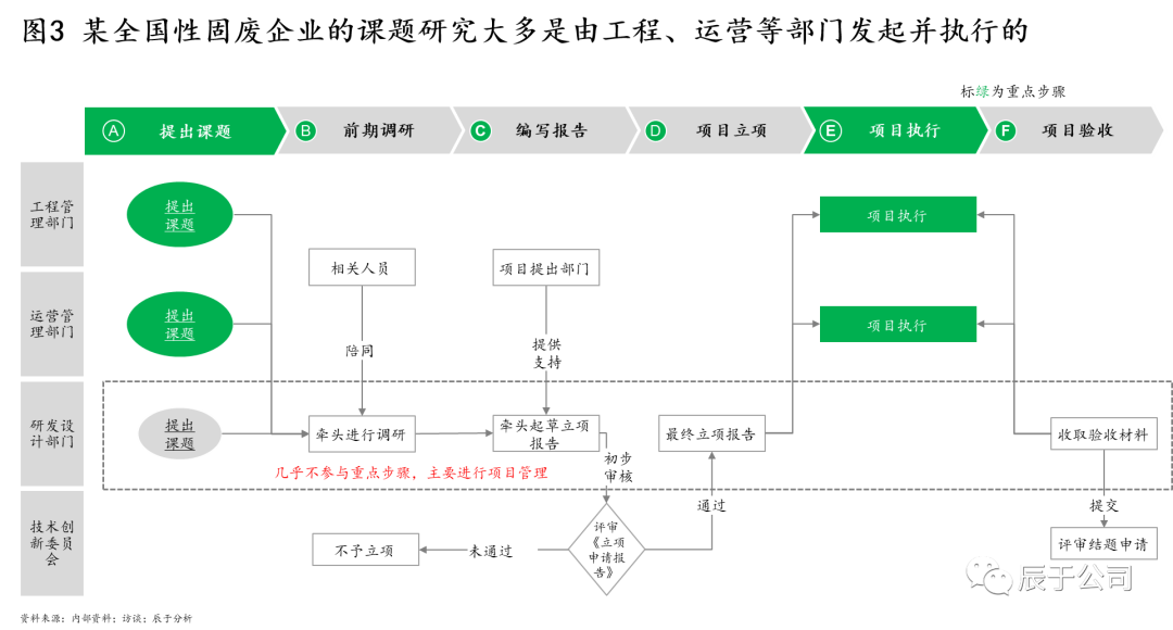 我們也注意到,很多生態(tài)環(huán)保企業(yè)研發(fā)活動的起點并非由戰(zhàn)略驅(qū)動,更多來自工程、運營等業(yè)務(wù)上的具體問題,技術(shù)研發(fā)則處于配合和支持其他部門的位置,引領(lǐng)性不足(見圖3)。由于缺乏對公司未來發(fā)展的前瞻性思考,他們也并未對各細(xì)分市場的發(fā)展趨勢、競爭對手、客戶需求、政策法規(guī)等進行深入分析,明確的產(chǎn)品規(guī)劃包括產(chǎn)品類型定義、定位以及如何與競爭對手實現(xiàn)差異化戰(zhàn)略等也就無從說起。